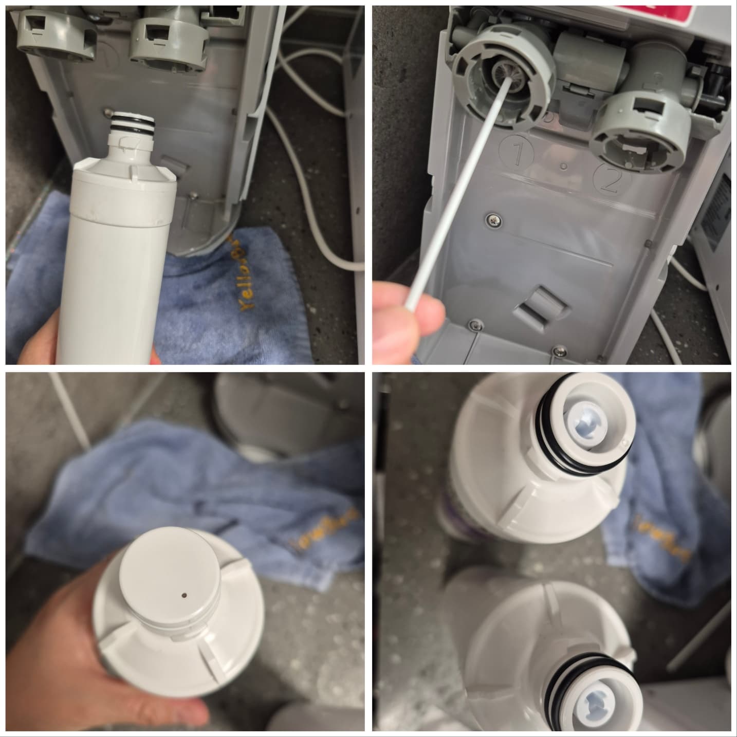 어느 정도 청소가 끝났으면 새로운 필터 뚜껑을 벗겨 정수기 필터 체결부에 돌려서 조립해 줍니다.